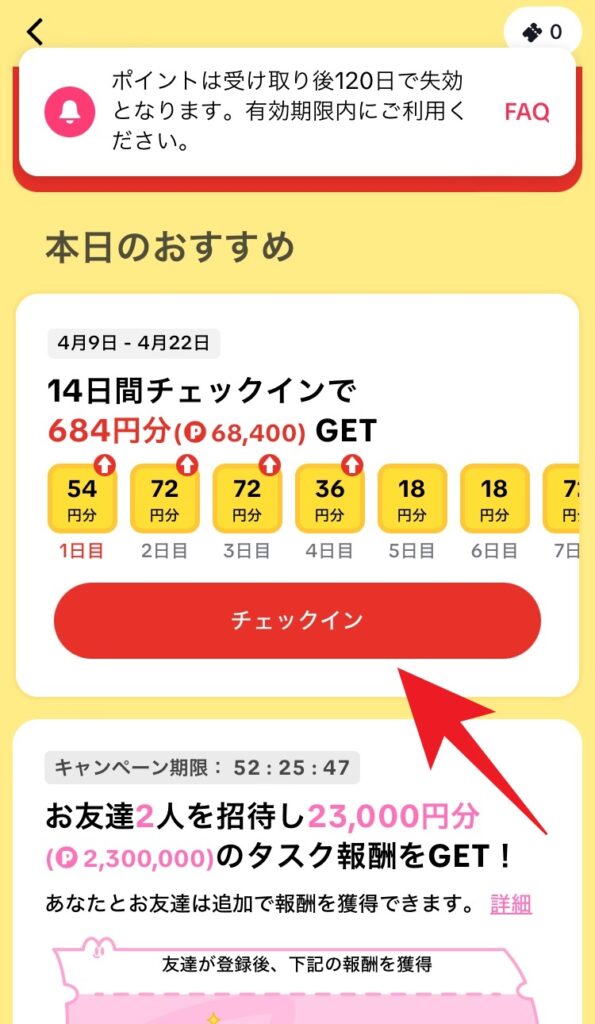 1日目のチェックインタスクは『54円分』と表示されていたので、これをクリアすると、54円分のポイントが貯まります。