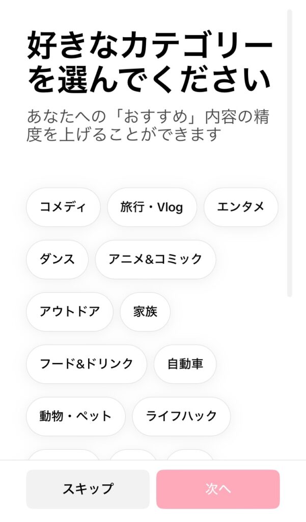 「好きなカテゴリーを選んでください」と表示されるので、好きなカテゴリーを選んで「次へ」をタップ。