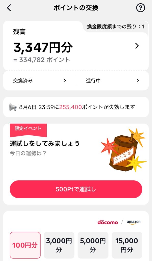 例えば、有効期限が迫っているので、溜まっているポイントが2,500円とかだと地獄です。100円ずつ交換しないといけないわけですが、ポイント交換は1日1回なので、多くのポイントを失う可能性があります。