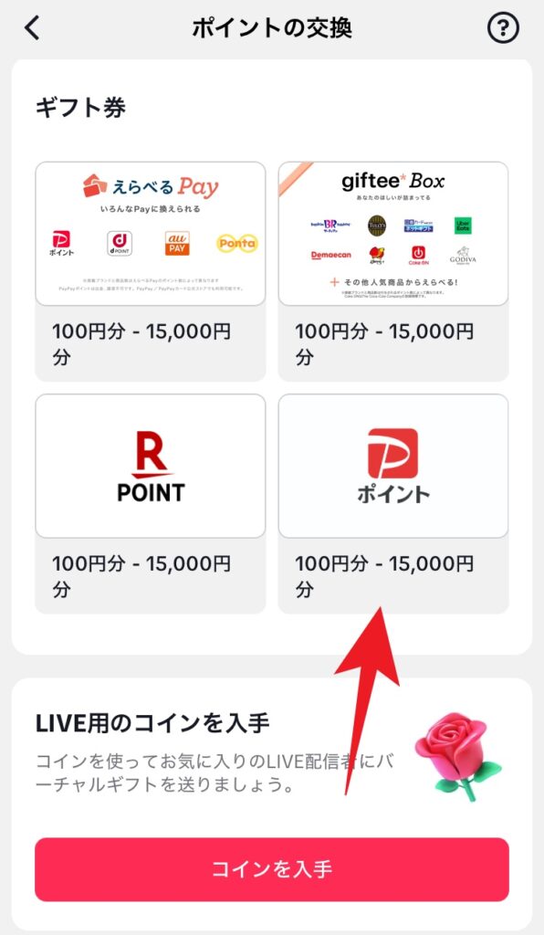 - TikTok Liteアプリ内でPayPayポイント交換手続きを行う(ギフトカード番号を発行)